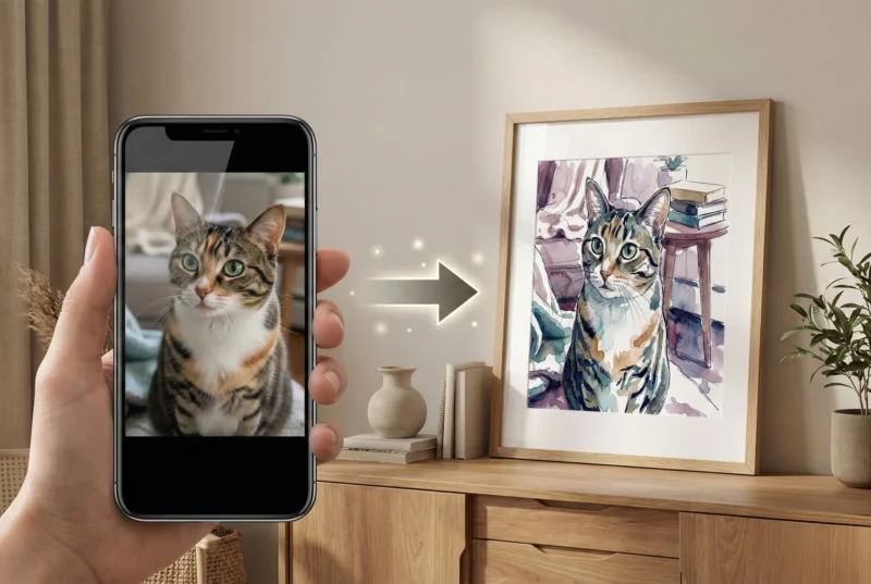 Mach aus einem einfachen Schnappschuss ein unvergessliches Bild für deine Wand. Foto hochladen, KI-Stil wählen und dein individuelles Tierportrait sofort als gerahmtes Wandbild oder Premium-Poster bestellen.